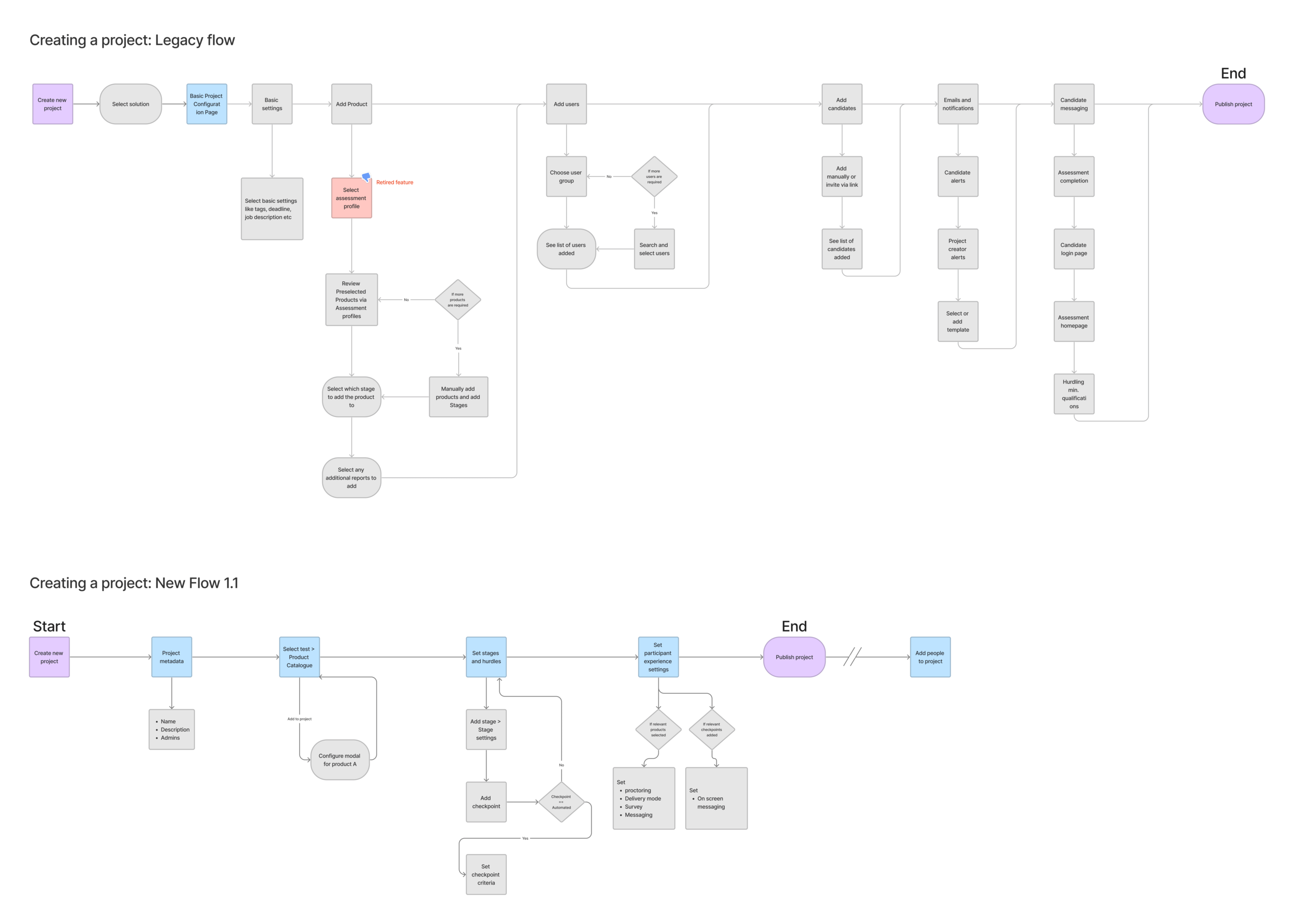 Shown below are some flows I made as part of the features I was working on to capture a user creating a new project. I’ve contrasted the legacy flow vs the new flow in the same diagram.